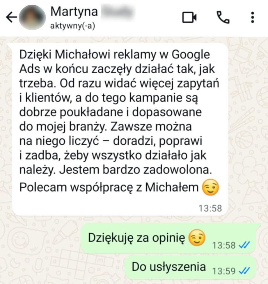 Zamiast zasypywać Cię tabelkami i wykresami, tłumaczę w prosty sposób, co dzieje się w Twoich kampaniach, pomagając przyciągnąć wartościowych klientów i zwiększyć zyski, dzięki czemu możesz skupić się na rozwoju firmy, oszczędzając czas i unikając marnowania pieniędzy na nieskuteczne reklamy.